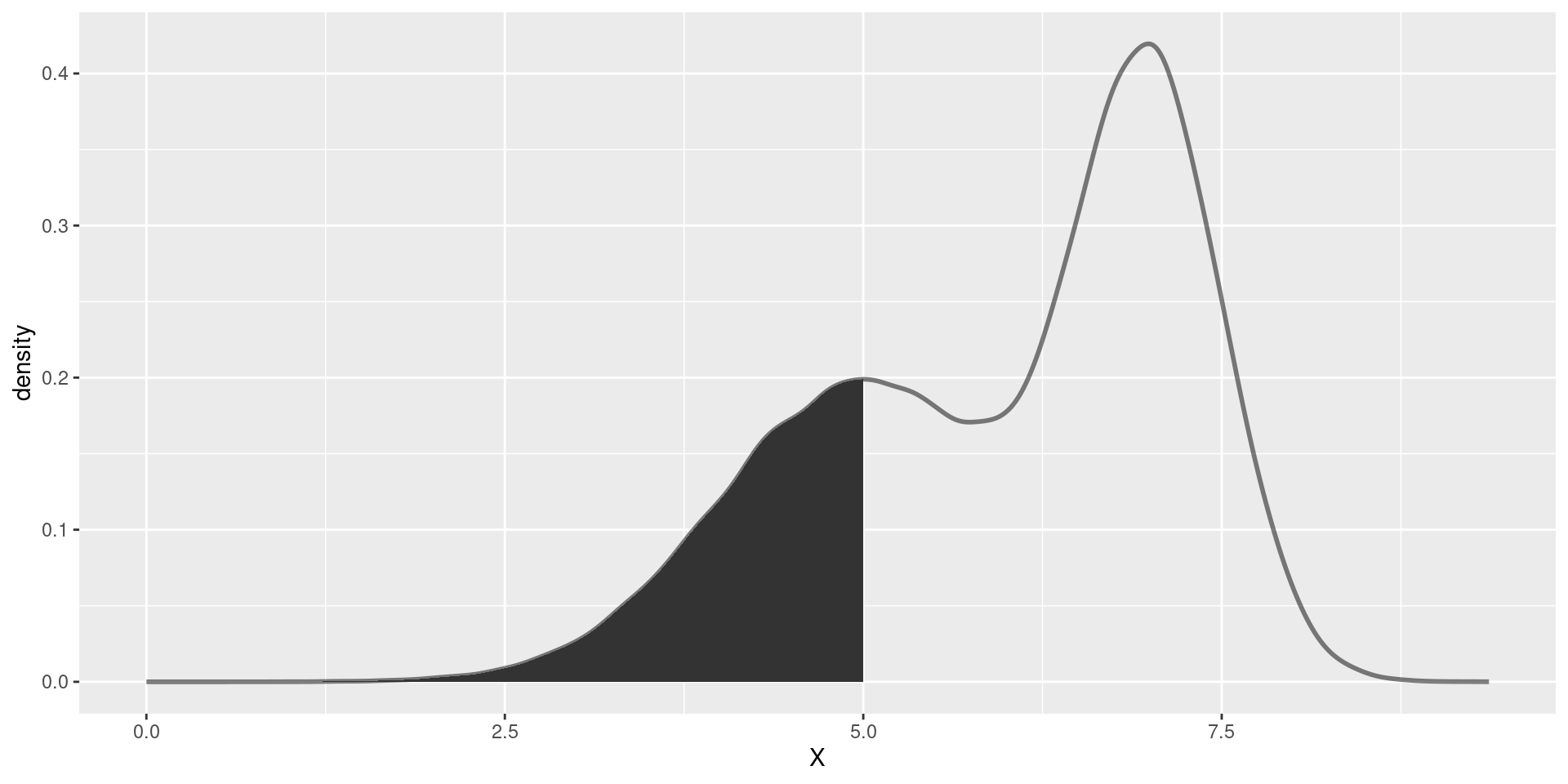 \(\operatorname{P}(X \le b) = {}\) the area under the density curve, to the left of \(b\).